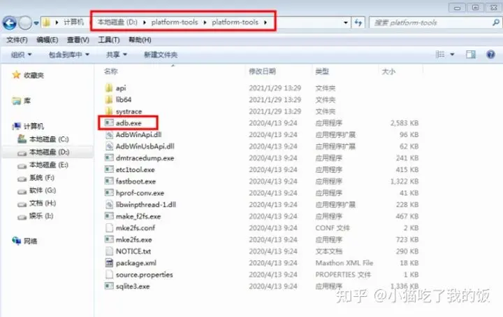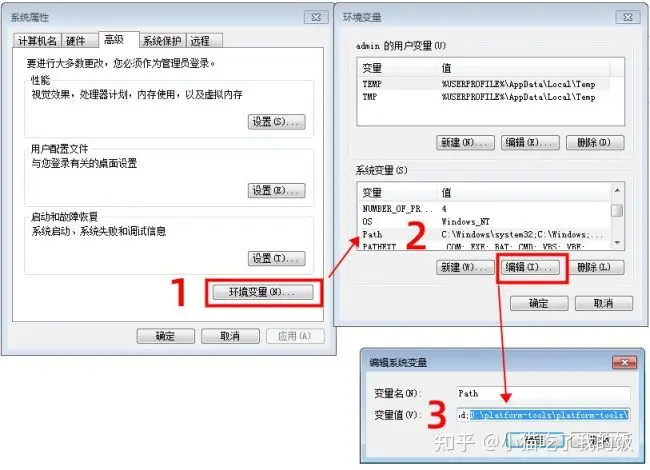打开“我的电脑->属性->系统高级设置->环境变量”,找到Path,选择编辑,在变量值后面加入platform-tools文件夹的路径:D:\platform-tools\platform-tools\