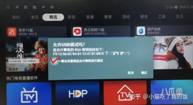 (4)在上一步连接电视的时候,电视这边会有这个“允许USB调试吗”的提示,一定记得勾选一律允许。