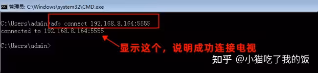 (3)根据上面获得的ip地址192.168.8.164,在CMD命令行输入 adb connect 192.168.8.164:5555 连接到TCL电视。(注意,这里的IP地址到时候改成你自己电视的IP地址)