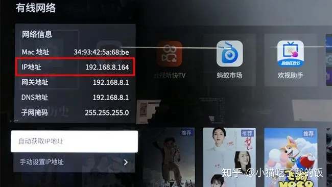 (1)首先将电脑和电视连接到同一网络下。查看TCL电视的ip地址,我的这台电视的ip为192.168.8.164。